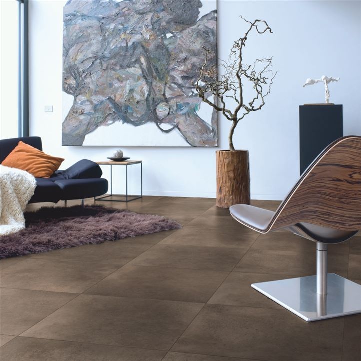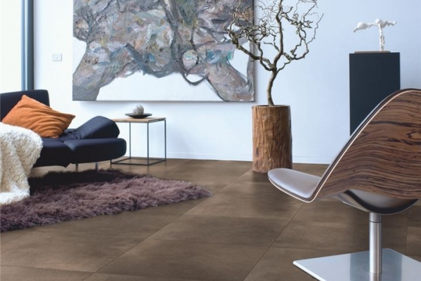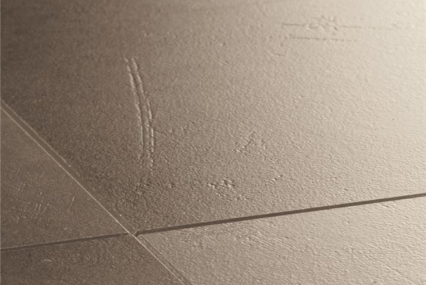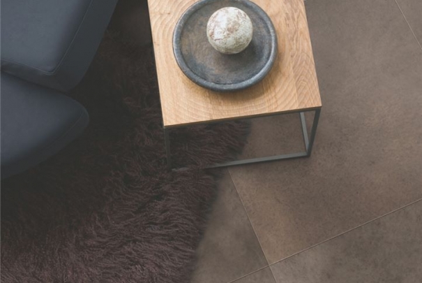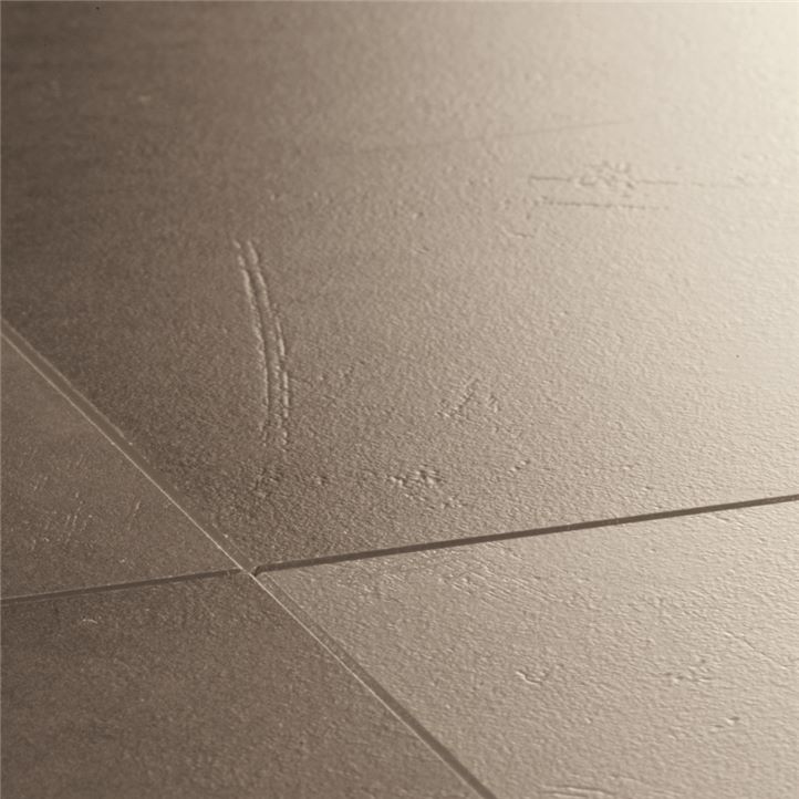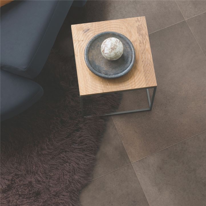 Large laminate tiles with subtle V-grooves. Combine the durability of an original tile floor with the practical benefits of laminate.