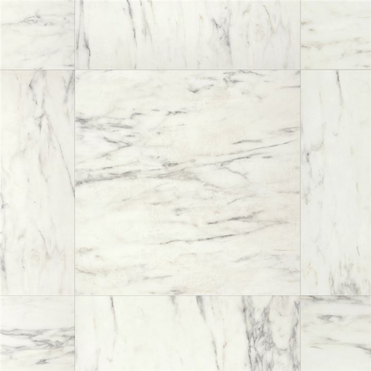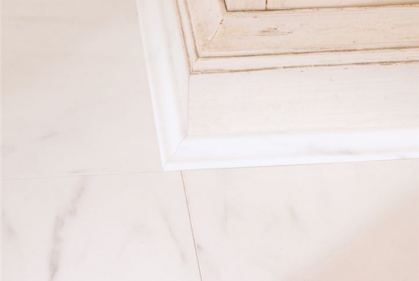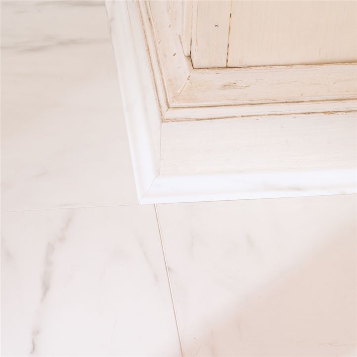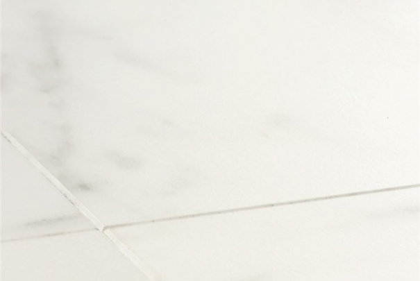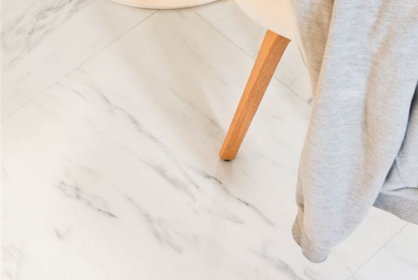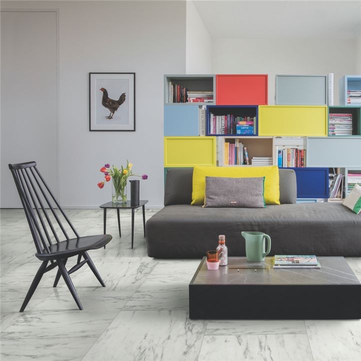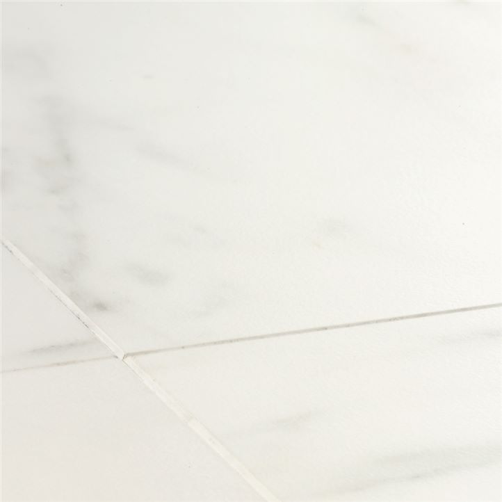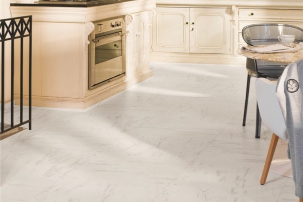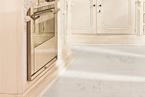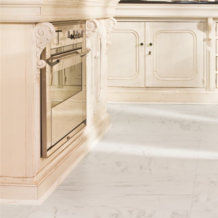 Large laminate tiles with subtle V-grooves. Combine the durability of an original tile floor with the practical benefits of laminate.
