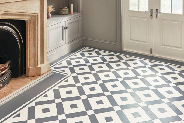 The clean bold lines of Lansdown are highlighted by its simple grid pattern of square tiles in Dove Grey and Lace. Ideal for an understated yet elegant interior, this striking design reflects the historic origins of geometric tiled floors in a contemporary style.