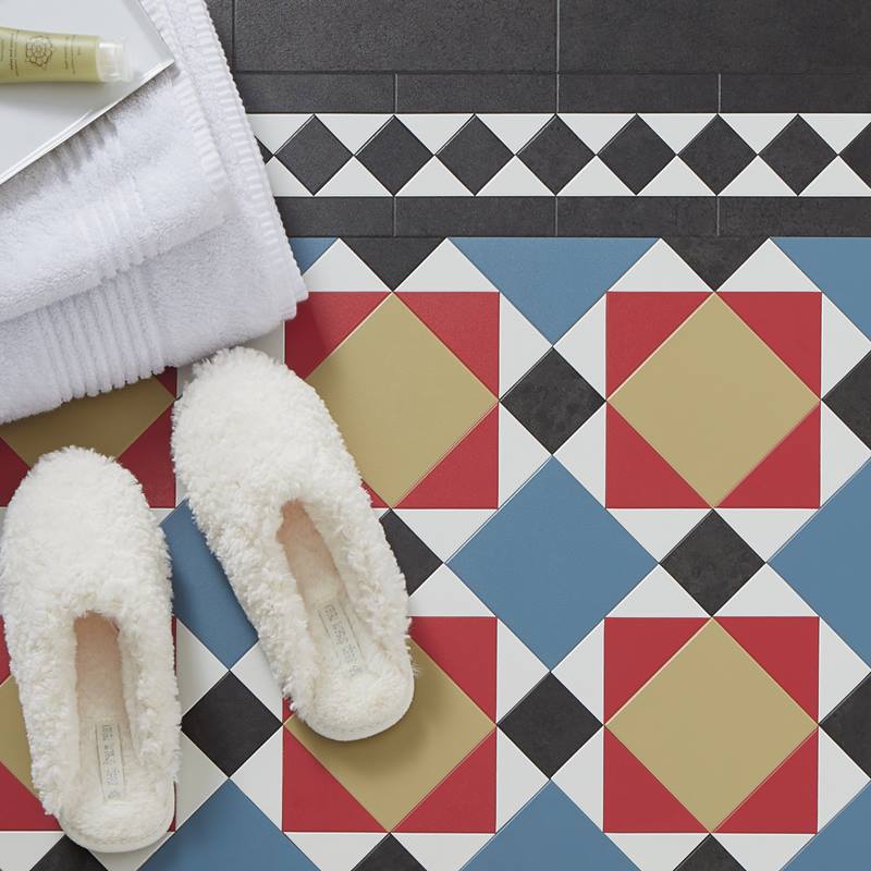 Mayfair is an iconic pattern formed of square and triangular tiles, traditionally found in the entrance halls of Victorian homes. For a contemporary twist, this opulent modern interpretation combines Crimson, Azure, Gold, Lace and Nero for a floor that makes a real statement.