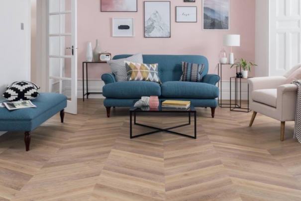 Featuring a worn limed-washed look our Rose Washed Oak planks are available in the chevron Apex design. With slightly pink and rosy tones throughout this floor is an unexpected alternative to brown and grey floors and looks great when paired with soft pastel and neutral tones.