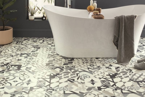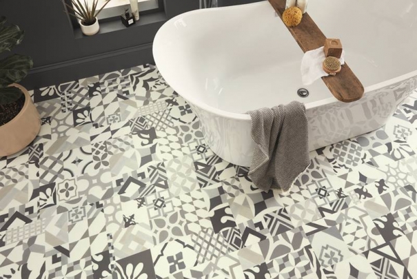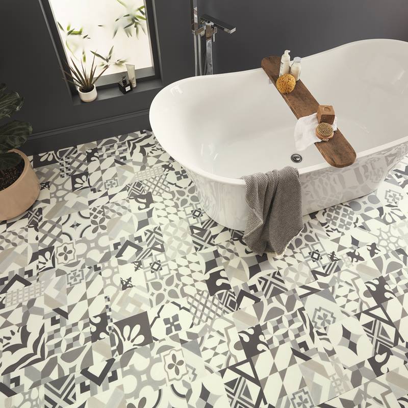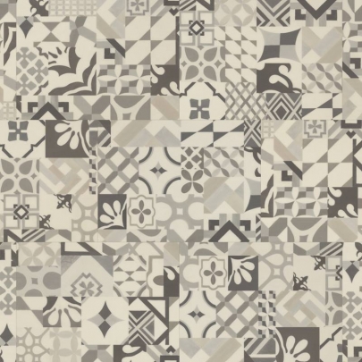 Casablanca presents a non-uniform, patchwork arrangement that incorporates a stylish combination of geometric forms, curves and crests influenced by medieval Spanish architecture, with a monochrome palette of grey shades to create a contemporary statement floor.